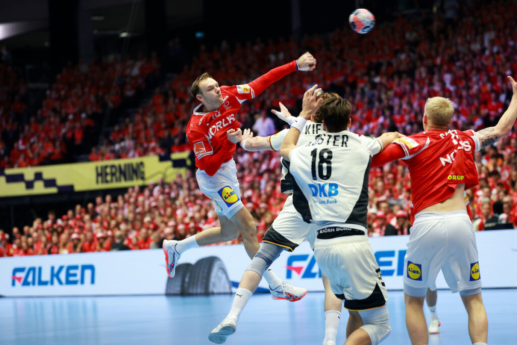Herningo arenoje net 15 tūkst. audringų sirgalių palaikoma Danijos rinktinė nuo vokiečių atitrūko tik antrame kėlinyje ir iškovojo pergalę 34:27 (18:16).